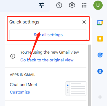 2.点击右上角的齿轮进入Gmail邮箱设置界面,选择第一个"查看所有设置",如下图;